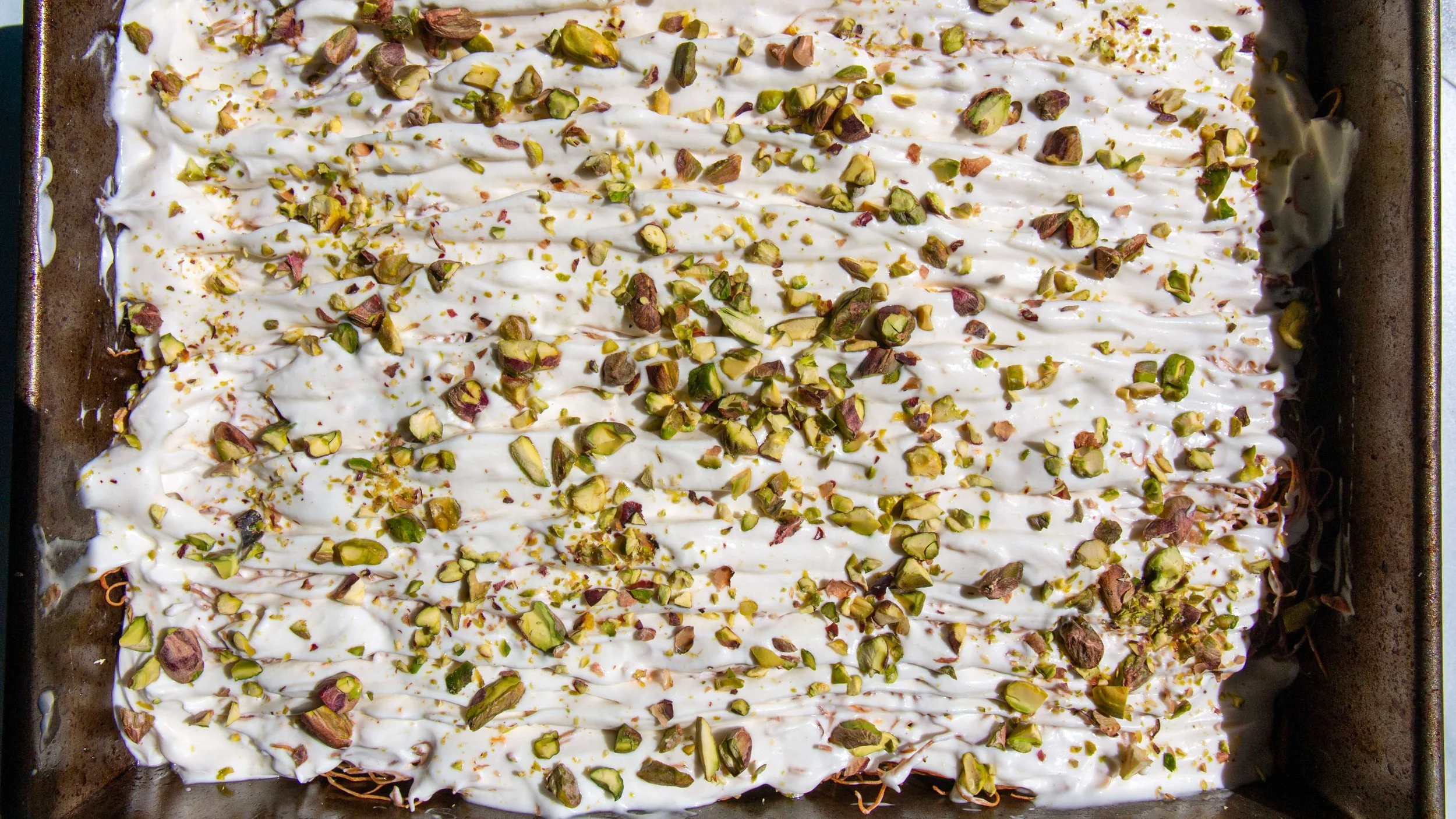 While the Kataifi base is cooking for the last 20 minutes, make the yogurt cream. Put the yogurt, powdered sugar, heavy cream, and orange zest into the bowl of a stand mixer and whisk at high speed for 1-1.5 minutes, until you have a fluffy and thick cream. Spread all over the cooled dough with a rubber spatula and refrigerate for at least one hour. Top with the chopped pistachios and serve.