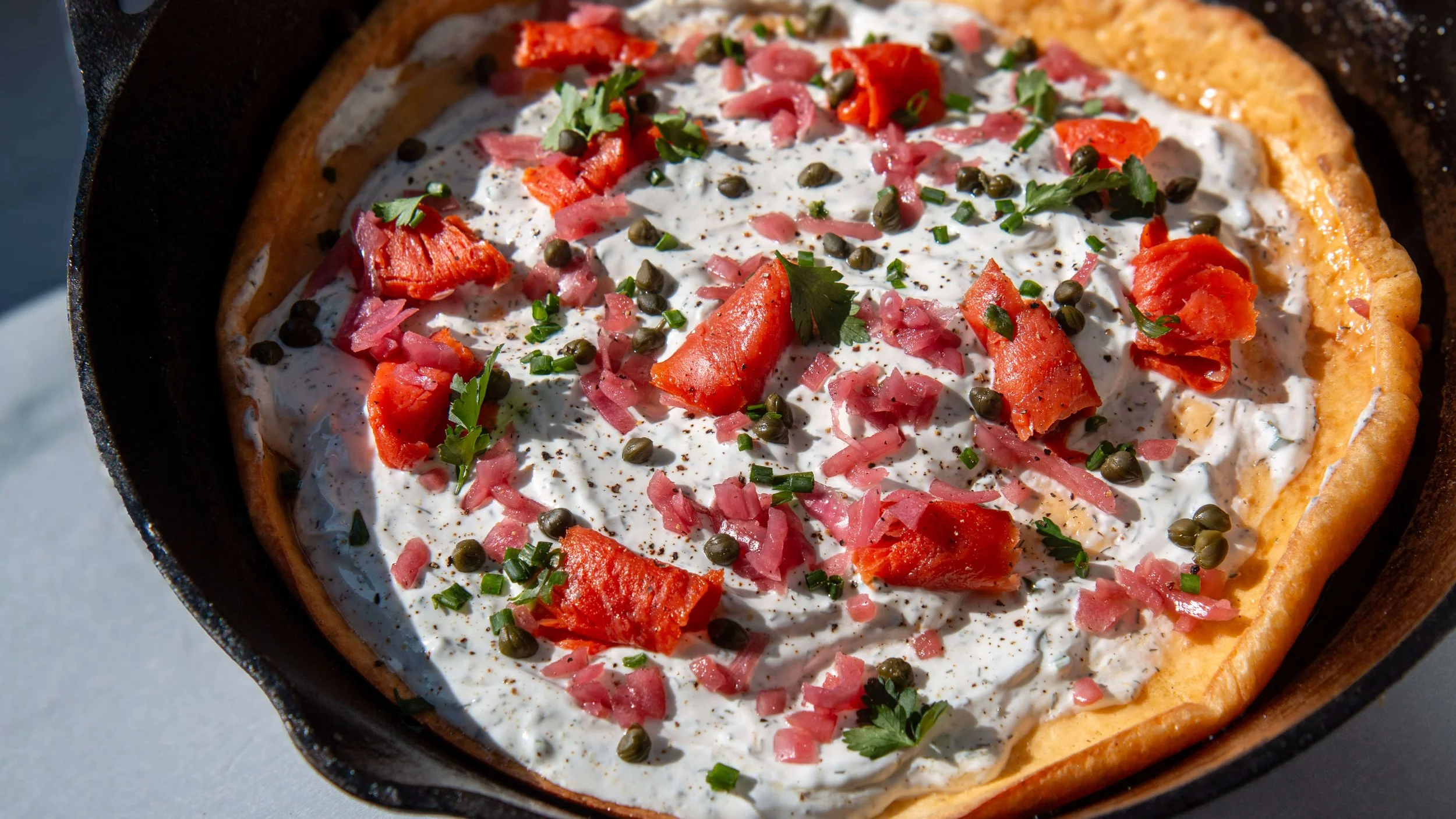 This is the kind of brunch centerpiece that looks impressive but comes together effortlessly. Made with Nounós Creamery Classic Plain Greek Yogurt, the batter bakes up tall, golden, and custardy—while delivering an extra boost of protein in every slice. Topped with a creamy herb garlic yogurt spread, silky smoked salmon, briny capers, and bright pickled onions, it’s a savory, flavor-packed dish that feels special enough for entertaining yet simple enough for a slow weekend morning at home.